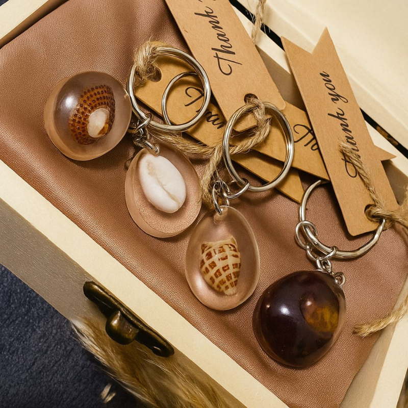 Seashell Keychains: Real shells preserved in polished resin domes, attached to sturdy metal rings with twine accents. Each keychain comes with a “Thank You” gift tag.