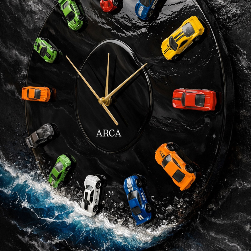 Racing Car Clock: A dramatic black resin clock featuring colorful toy cars as hour markers. Gold hands and a wave of blue resin with white foam details add motion and energy. Perfect for kids’ rooms, game rooms, or car enthusiasts.