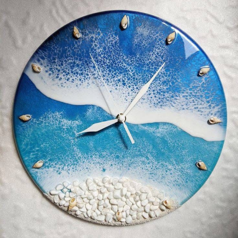 Classic Beach Clock: Turquoise and white resin creates realistic ocean waves, with real seashells marking the hours. White pebbles form a sandy beach at the bottom. Clean, coastal style for any space.