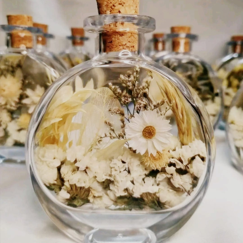 Glass Bottle Keepsakes: Individual blooms and petals preserved in rounded glass bottles with cork stoppers. Perfect for shelf display or gifting.