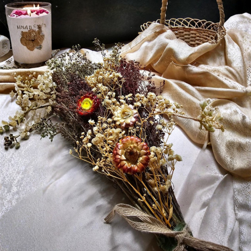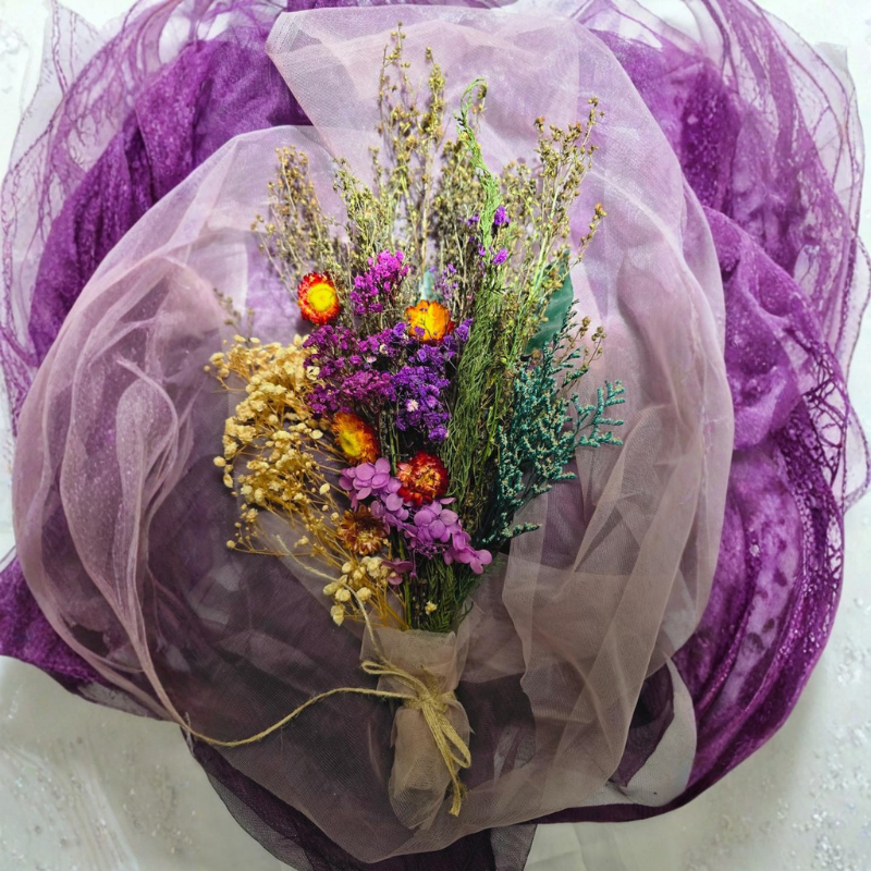 Wrapped Bouquets: Dried flowers hand-tied and wrapped in soft tulle or fabric. Ready to give as gifts or use as lasting home decor.