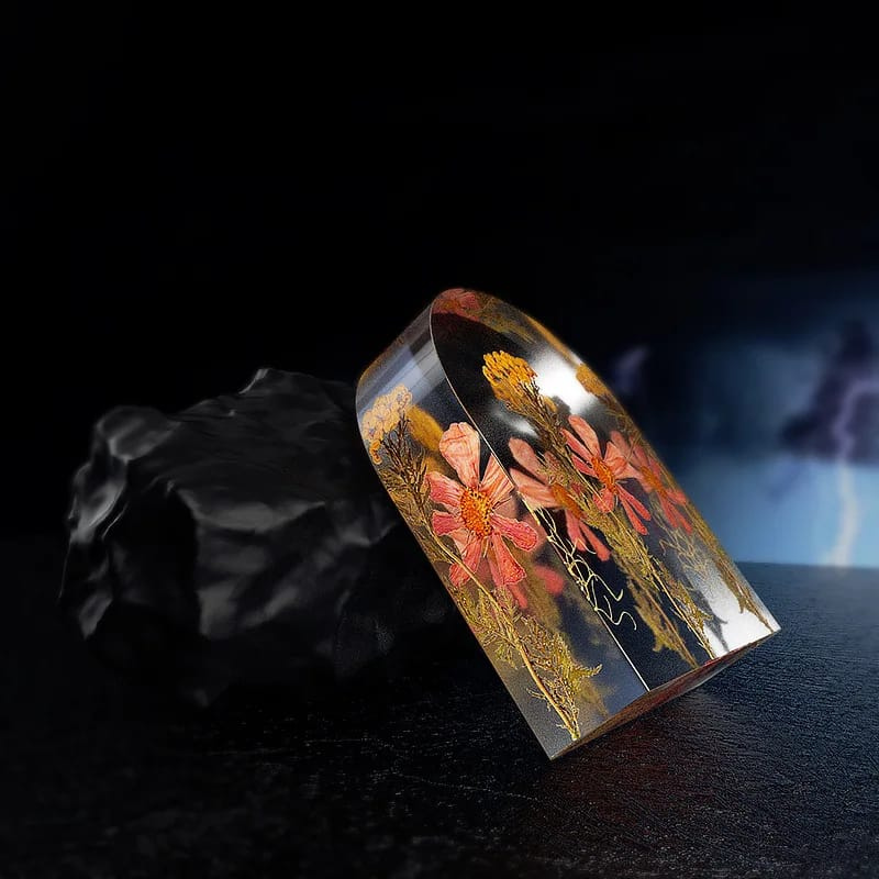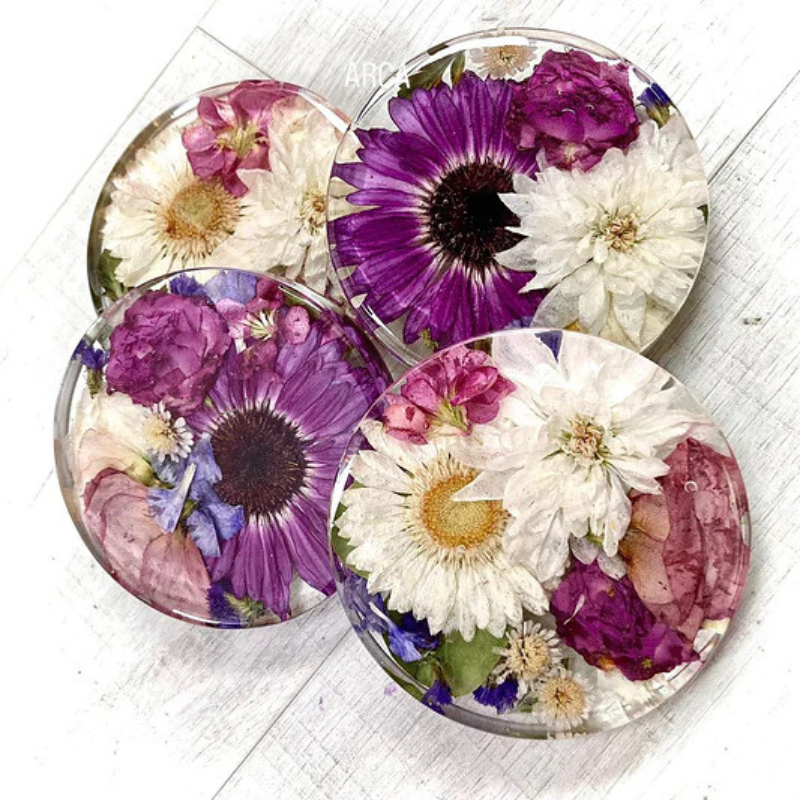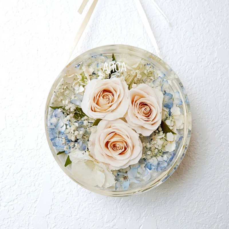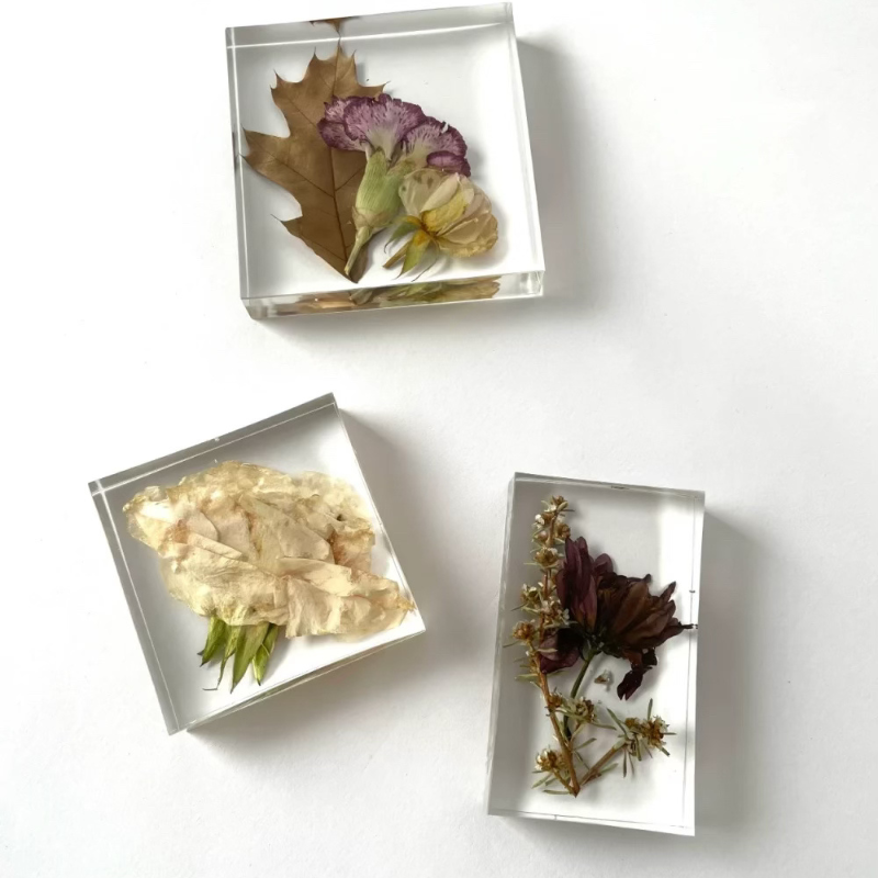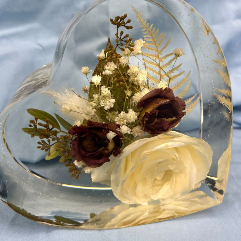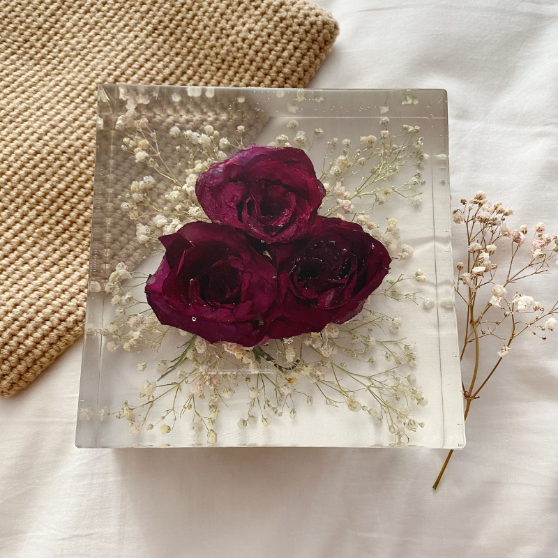 Your flowers are dried and artfully arranged within crystal resin, then cured to a glass-like finish. The result is a solid, durable piece that protects and magnifies the natural beauty inside. Light passes through the petals, creating depth and glow from every angle.
